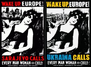 The similarity in this European discourse can also be seen in the current remake of the famous “Wake up Europe” poster by the design group Trio from the Bosnian war in 1993. At that time, it bore the subtitle: “Sarajevo calls every man, woman and child”, and in the 2022 adaptation, it reads: “Ukraine calls every man, woman and child.”